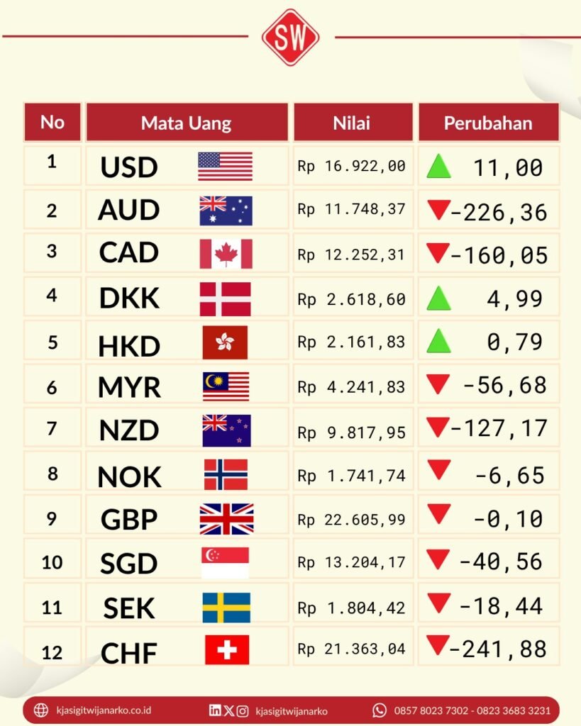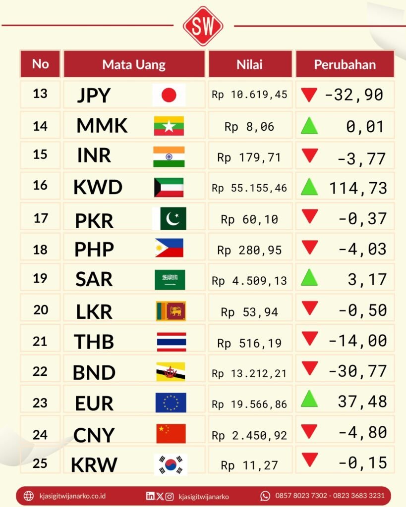 Beberapa mata uang asing mengalami fluktuasi nilai tukar. Ada yang menguat, namun tidak sedikit pula yang melemah terhadap rupiah. Kondisi ini mencerminkan dinamika pasar global yang masih berpengaruh terhadap nilai tukar domestik.