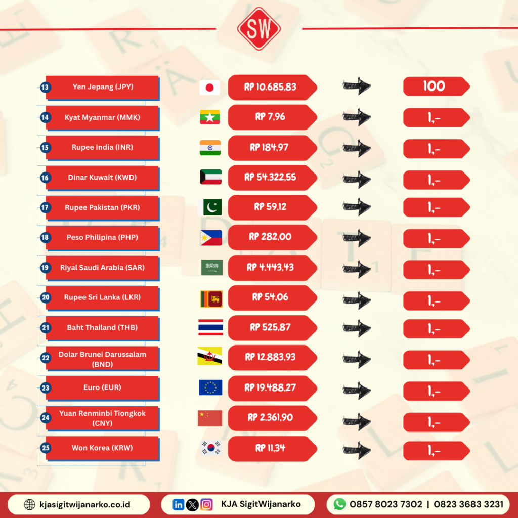 Perubahan nilai kurs valuta asing kembali diberlakukan oleh pemerintah Indonesia melalui Keputusan Menteri Keuangan Nomor 29/MK/EF.2/2025 yang berlaku dari tanggal 16 Desember 2025 sampai dengan 23 Desember 2025. Kebijakan ini menetapkan nilai tukar mata uang asing sebagai dasar pelunasan Bea Masuk, Pajak Pertambahan Nilai Barang dan Jasa (PPN), Pajak Penjualan atas Barang Mewah (PPnBM), Bea Keluar, dan Pajak Penghasilan atas Pemasukan Barang.