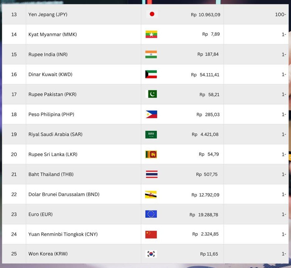 Dalam ketentuan ini, nilai tukar mata uang asing terhadap Rupiah dikonfirmasi untuk sejumlah mata uang utama, seperti Dolar AS, Euro, Yen Jepang, Yuan Tiongkok, Peso Filipina, hingga mata uang dari negara-negara lain seperti Dolar Australia, Franc Swiss, dan Dolar Kanada. Sebagai contoh, nilai tukar untuk Dolar AS ditetapkan sebesar Rp 16.581,00, sedangkan untuk Euro sebesar Rp 19.288,78. Penetapan ini memberikan kejelasan bagi pelaku usaha, importir, dan petugas bea cukai dalam melakukan penghitungan dan pelaporan fasilitasi perpajakan dan pengeluaran barang impor. Berikut ini penetapan nilai mata uang yang berlaku: