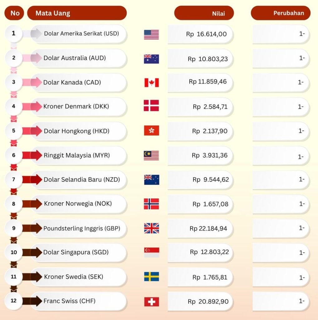 Perubahan nilai kurs valuta asing kembali diberlakukan oleh pemerintah Indonesia melalui Keputusan Menteri Keuangan Nomor 22/MK/EF.2/2025 yang berlaku dari tanggal 29 Oktober 2025 sampai dengan 4 November 2025. Kebijakan ini menetapkan nilai tukar mata uang asing sebagai dasar pelunasan Bea Masuk, Pajak Pertambahan Nilai Barang dan Jasa (PPN), Pajak Penjualan atas Barang Mewah (PPnBM), Bea Keluar, dan Pajak Penghasilan atas Pemasukan Barang.