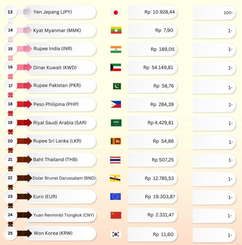 Dalam ketentuan ini, tercantum mata uang asing yang kursnya akan digunakan, termasuk dolar AS, dolar Australia, dolar Kanada, euro, yuan, rupiah, dan mata uang lainnya yang berlaku. Hal ini memberikan kejelasan bagi pelaku usaha, importir, eksportir, serta pejabat bea cukai terkait aspek administrasi dan keuangan saat melakukan pungutan maupun pembayaran. Penetapan ini juga sejalan dengan berbagai dasar hukum, seperti Undang-Undang Nomor 7 Tahun 1983 tentang Pajak Penghasilan dan Undang-Undang Nomor 8 Tahun 1983 tentang Pajak Pertambahan Nilai Barang dan Jasa, yang mengatur ketentuan perpajakan terkait nilai tukar mata uang asing.
