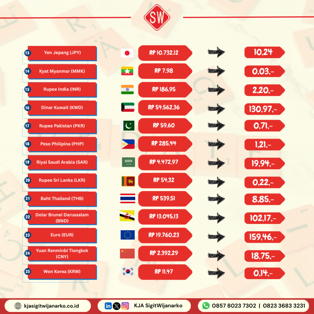 Dalam ketentuan ini, tercantum mata uang asing yang kursnya akan digunakan, termasuk dolar AS, dolar Australia, dolar Kanada, euro, yuan, rupiah, dan mata uang lainnya yang berlaku. Hal ini memberikan kejelasan bagi pelaku usaha, importir, eksportir, serta pejabat bea cukai terkait aspek administrasi dan keuangan saat melakukan pungutan maupun pembayaran. Penetapan ini juga sejalan dengan berbagai dasar hukum, seperti Undang-Undang Nomor 7 Tahun 1983 tentang Pajak Penghasilan dan Undang-Undang Nomor 8 Tahun 1983 tentang Pajak Pertambahan Nilai Barang dan Jasa, yang mengatur ketentuan perpajakan terkait nilai tukar mata uang asing.