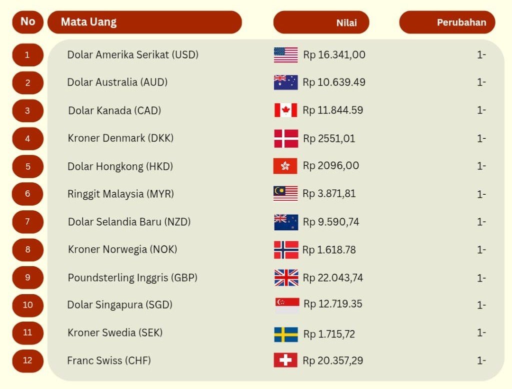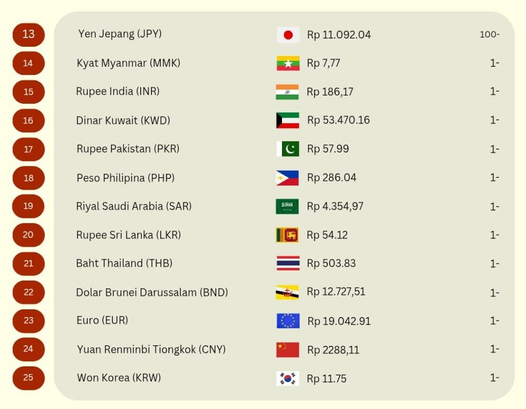 Berikut Penetapan Nilai Kurs sebagai dasar pelunasan Bea Masuk, Pajak Pertambahan Nilai Barang dan Jasa dan Pajak Penjualan atas Barang Mewah, Bea Keluar, dan Pajak Penghasilan yang berlaku untuk tanggal 3 September 2025 sampai dengan 9 September 2025