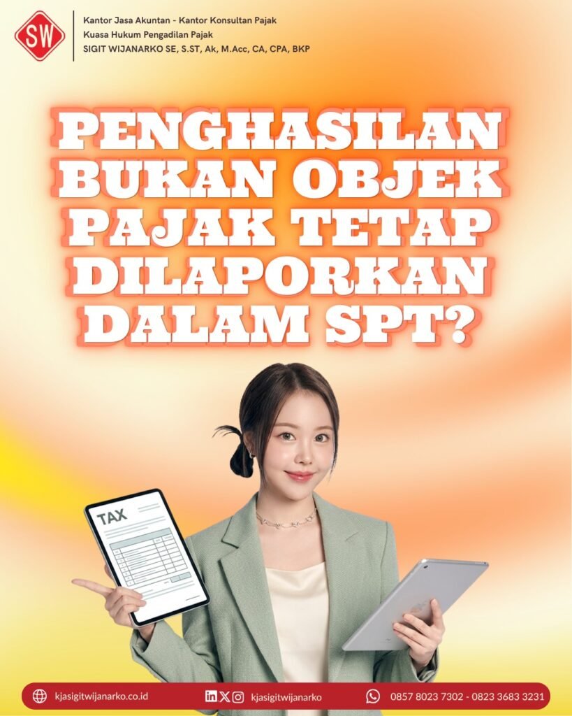 Wajib Pajak Orang Pribadi (WP OP) tetap memiliki kewajiban untuk melaporkan seluruh penghasilannya dalam Surat Pemberitahuan (SPT) Tahunan Pajak Penghasilan (PPh), termasuk penghasilan yang tidak termasuk objek pajak.