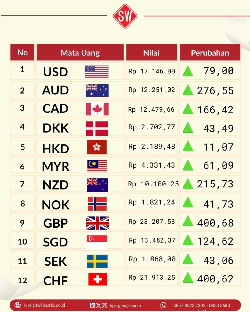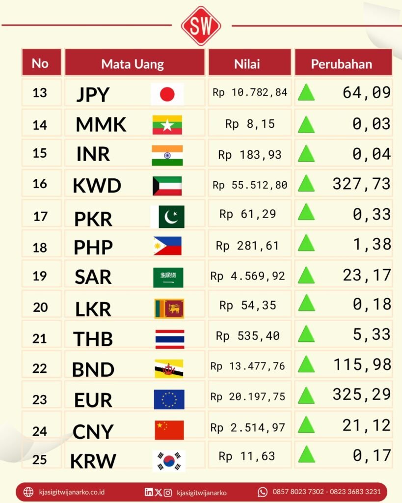 Berdasarkan Keputusan Menteri Keuangan (KMK) terbaru, berikut adalah daftar kurs pajak untuk beberapa mata uang utama: